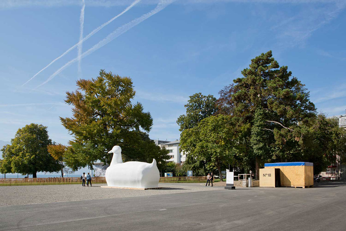 | Inspiré par l’historique Big Duck de Long Island, Olivier Cablat collecte des images correspondant au concept du duck, désignant selon le célèbre architecte Robert Venturi toute construction dont la forme reflète la fonction. Grâce à la Bourse Images Vevey Recherche et Développement 2013/2014, avec le soutien de Nestlé, il réunit des centaines de photographies des héritiers spirituels de ce canard construit en 1930. Le spectateur découvre cette théorie de l’évolution à l’intérieur d’une réplique du canard original de près de 6 mètres de haut et téléporté à Vevey à partir de clichés d’époque trouvés sur le web. Après une étape aux Rencontres d’Arles en 2015, le canard géant s’est depuis installé en Camargue, dans la réserve naturelle des Marais du Viguerat. Le projet du Français a fait également l’objet d’une publication éponyme, coéditée par Images Vevey et faisant partie intégrante de sa recherche. |