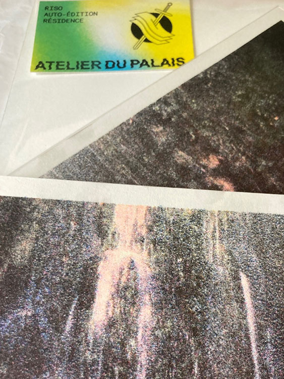 Edition de risographies, 2024 Trente exemplaires, A4, sur papier munken print cream, imprimées par Zélia Zinner à l’atelier du Palais, Arles