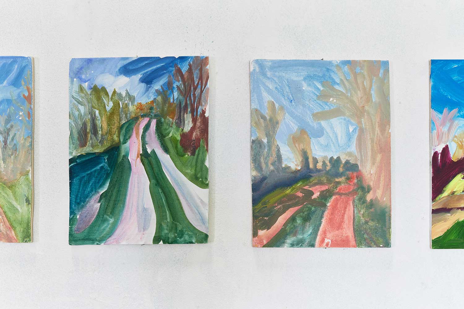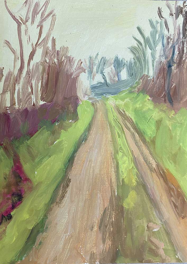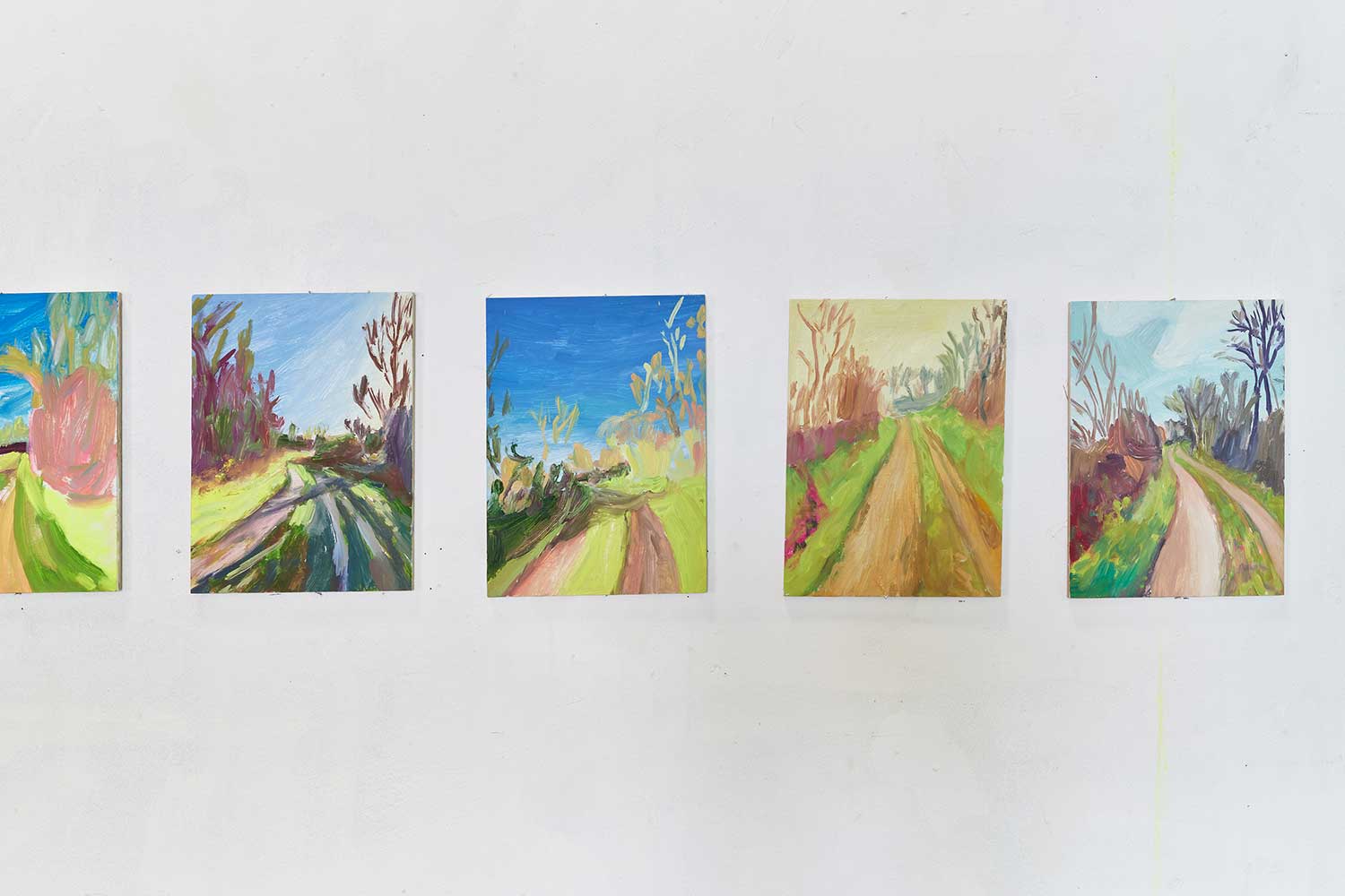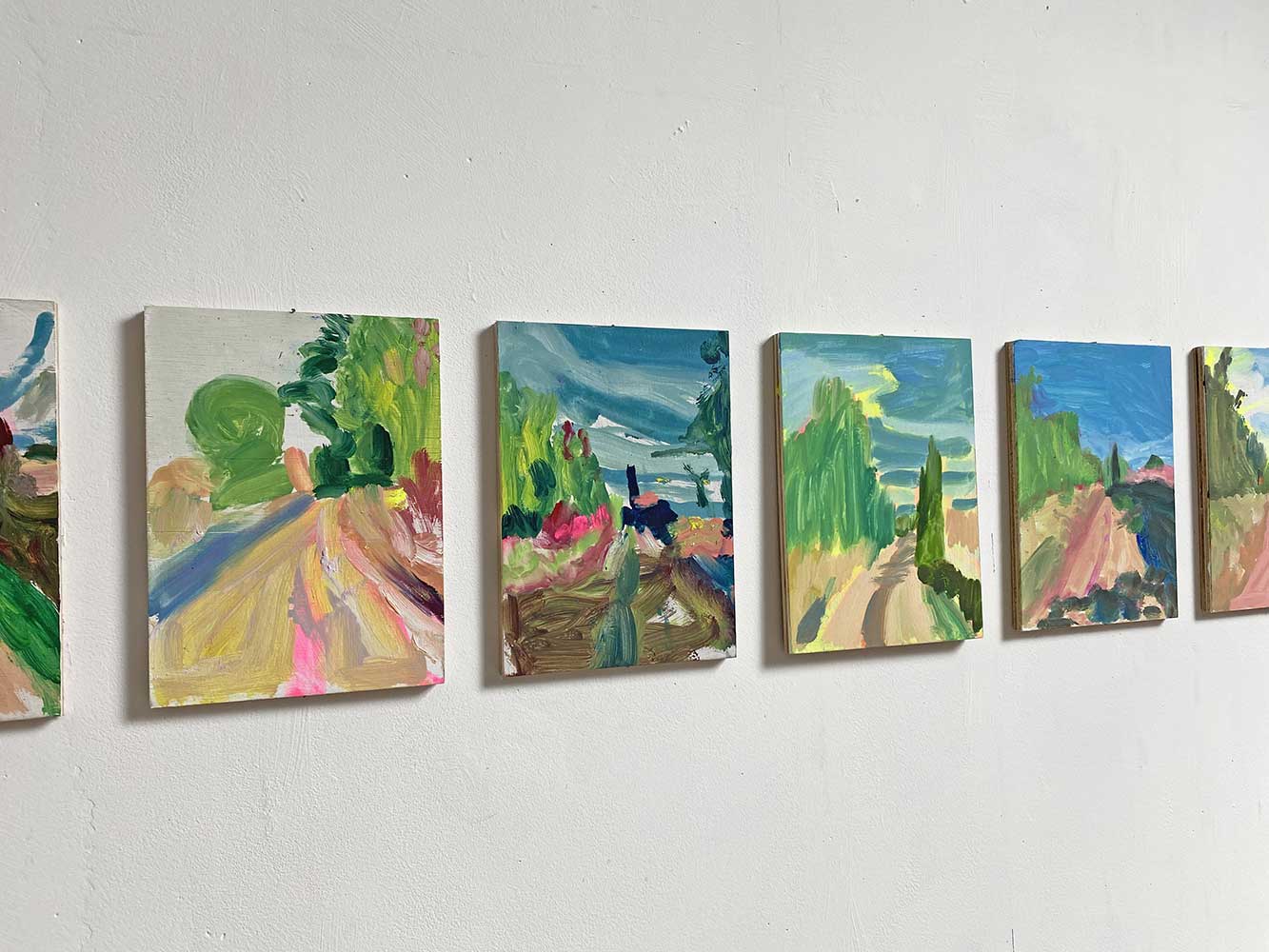 Il s’agit d’une nouvelle série, un travail en cours. Tous les jours je vais marcher sur un chemin, toujours le même, et au même endroit du chemin, je prends une photo avec mon téléphone. À partir de cette image, je réalise une peinture à l’huile sur bois de format 16x22cm. J’ai commencé ce rituel quotidien en décembre 2024. J’ai peint environ 200 peintures pour le moment. Ce projet parle du temps, de la répétition, du travail, de l’approfondissement du regard, de la contemplation. |