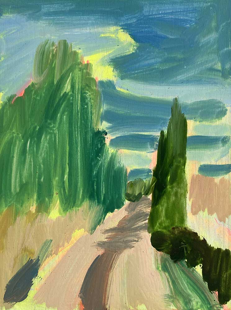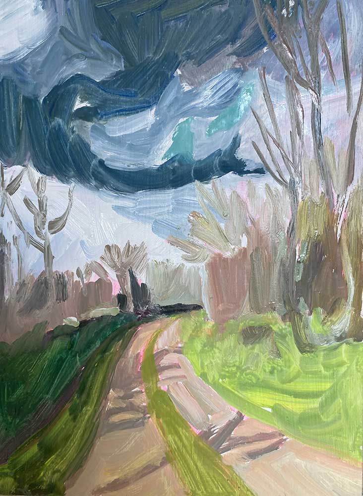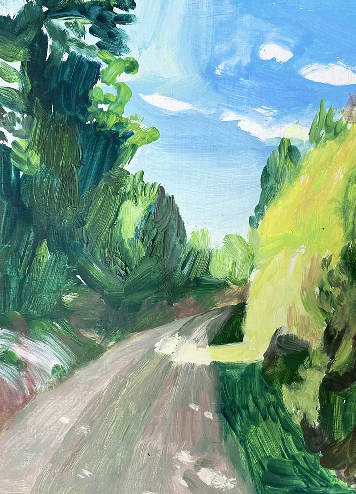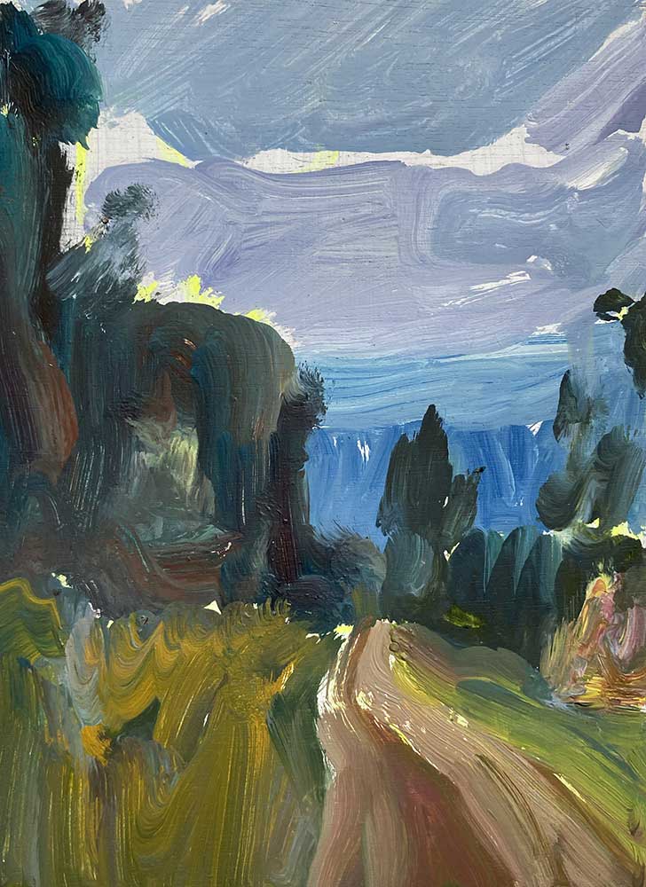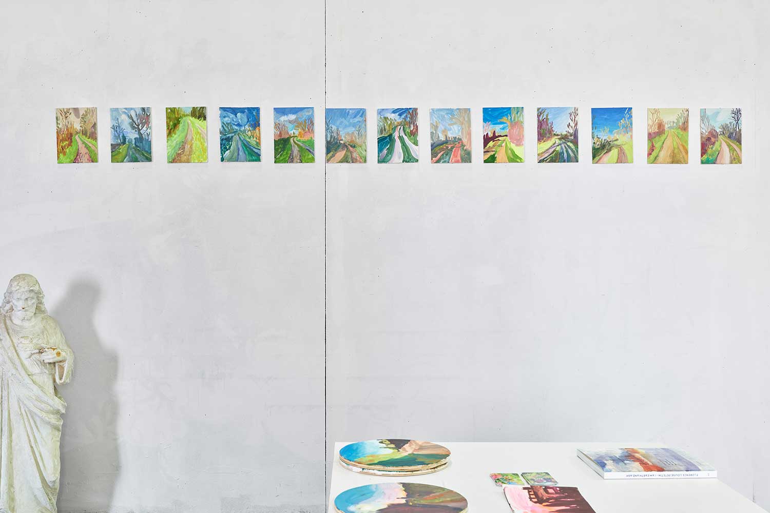 Il s’agit d’une nouvelle série, un travail en cours. Tous les jours je vais marcher sur un chemin, toujours le même, et au même endroit du chemin, je prends une photo avec mon téléphone. À partir de cette image, je réalise une peinture à l’huile sur bois de format 16x22cm. J’ai commencé ce rituel quotidien en décembre 2024. J’ai peint environ 200 peintures pour le moment. Ce projet parle du temps, de la répétition, du travail, de l’approfondissement du regard, de la contemplation. |