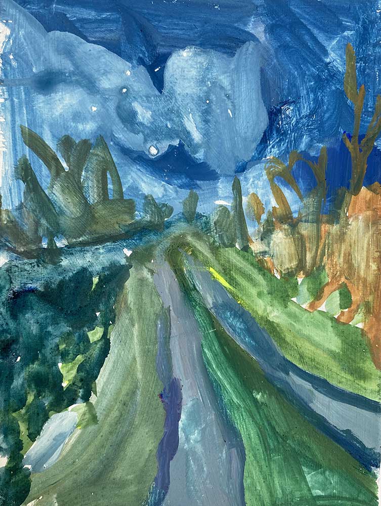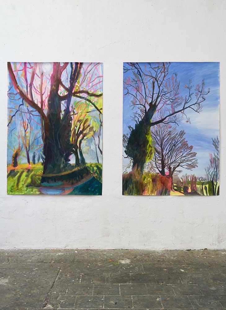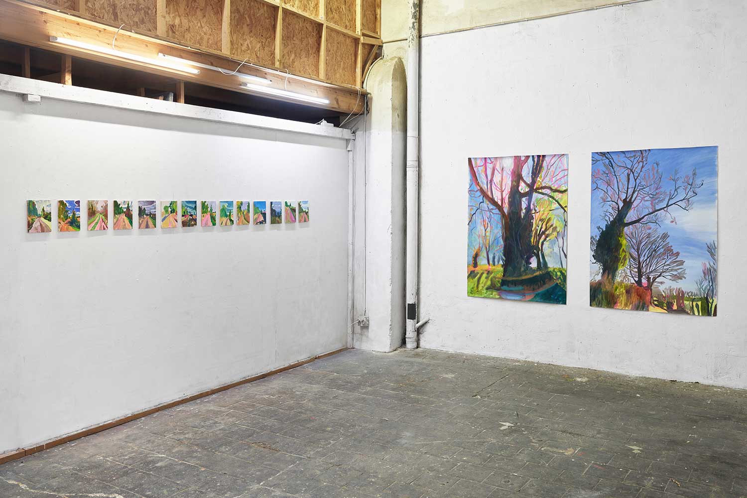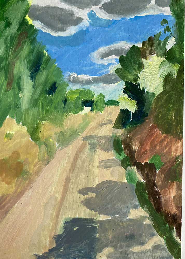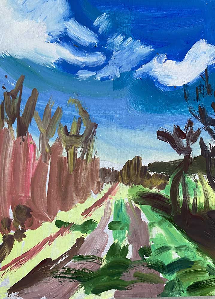 Il s’agit d’une nouvelle série, un travail en cours. Tous les jours je vais marcher sur un chemin, toujours le même, et au même endroit du chemin, je prends une photo avec mon téléphone. À partir de cette image, je réalise une peinture à l’huile sur bois de format 16x22cm. J’ai commencé ce rituel quotidien en décembre 2024. J’ai peint environ 200 peintures pour le moment. Ce projet parle du temps, de la répétition, du travail, de l’approfondissement du regard, de la contemplation. |