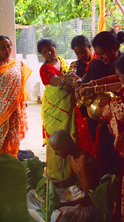 La nuit précédente, j’ai filmé les femmes qui sont allées recueillir l'eau sacrée dans des jarres en cuivre. Le feu est allumé pour appeler les éléments et recevoir leurs bénédictions. Telles des asparas de l'eau, de la terre, de l'air et du feu, leurs chants se mêlent doucement aux bruits de la forêt et à la conque qui résonne. La scène m’a semblée un conte décrit dans les poèmes mystiques hindous. Elle m’a tellement surprise et ravie que j’ai voulu lui rendre hommage.
