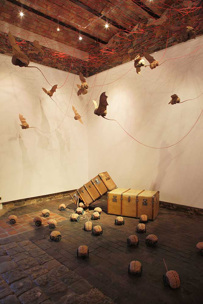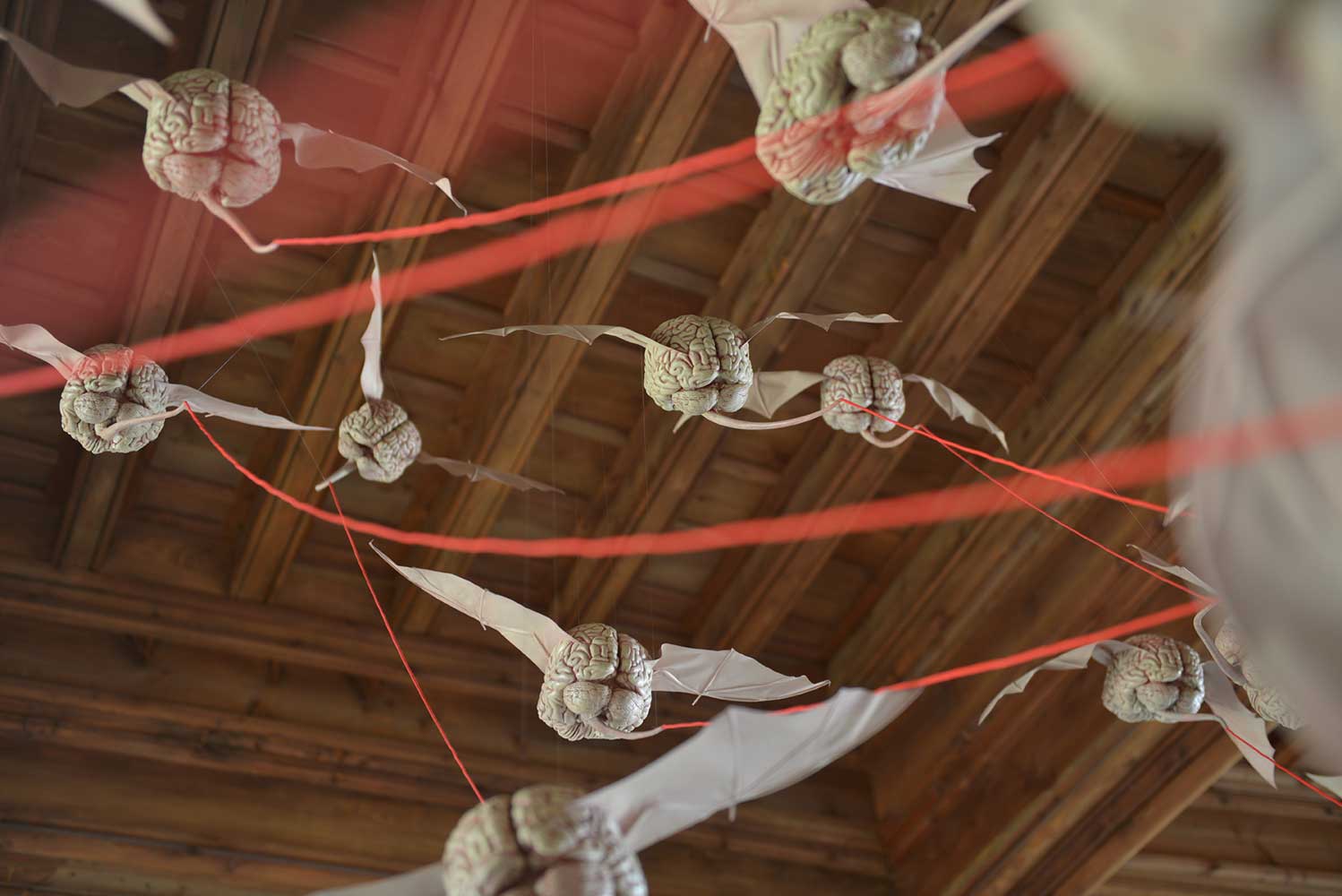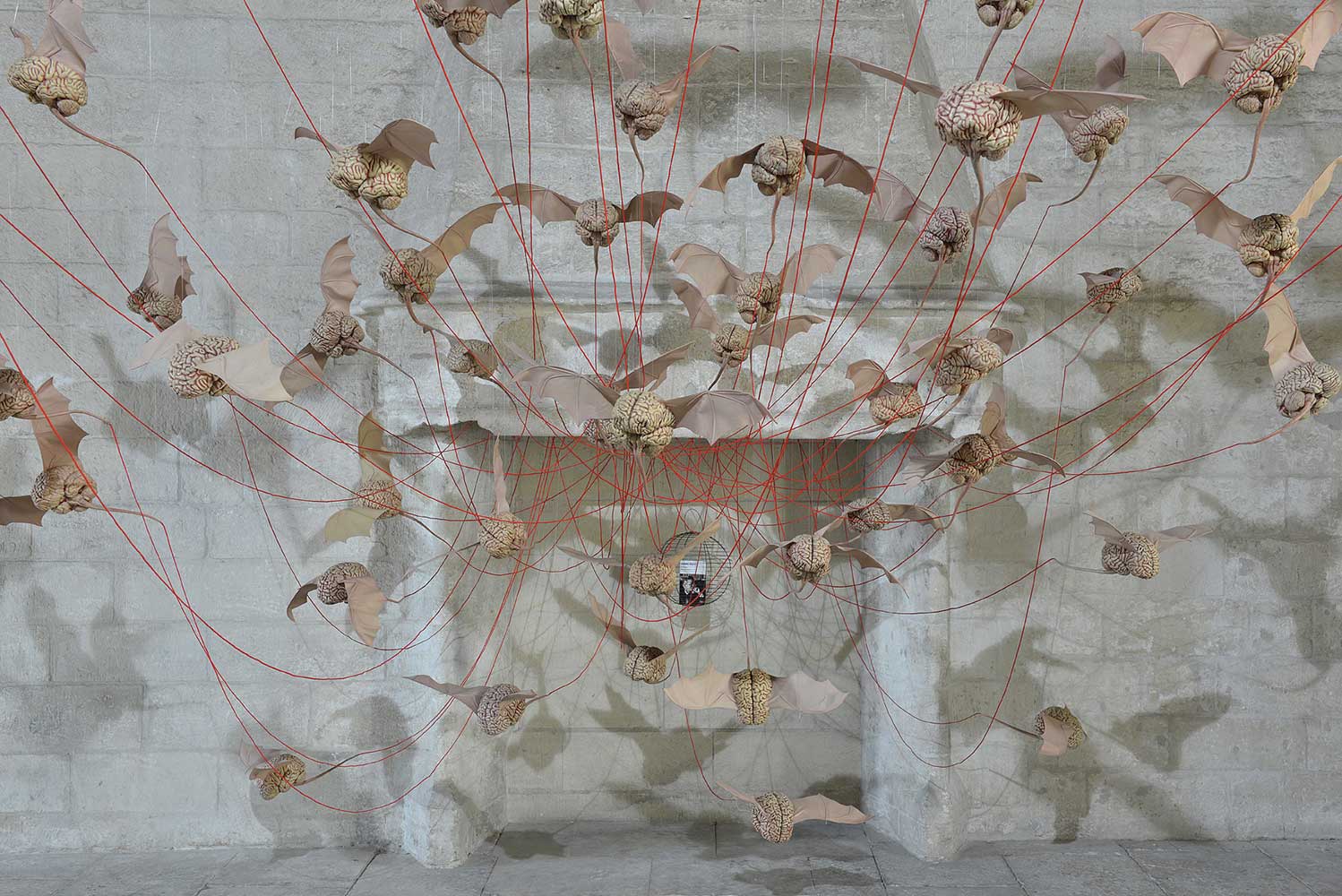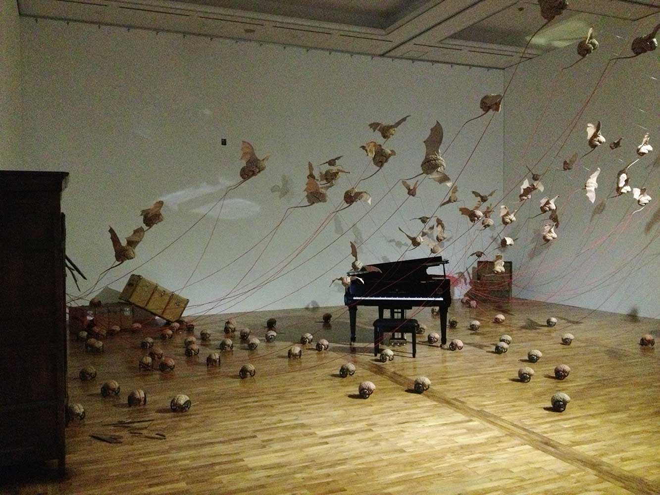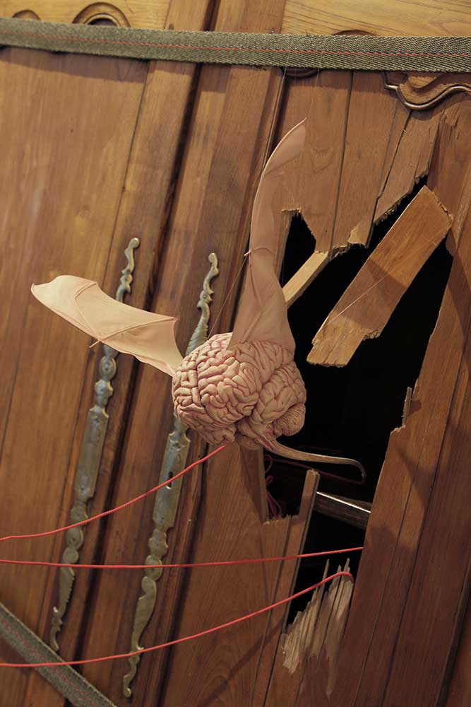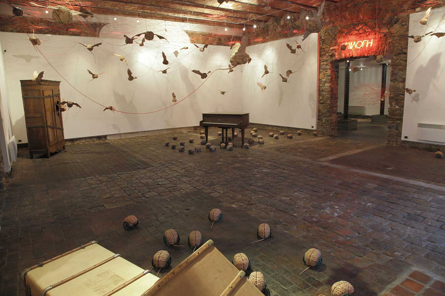 Installation sur 200 m2, 63 cerveaux volants et 63 cerveaux roulants (résine polyuréthane, acier, film polyester thermorétractable), un cerveau surdimensionné (résine polyester, acier, garcette noire), piano quart de queue, armoire et malles anciennes, mâchoires de requin, néon, garcette rouge
