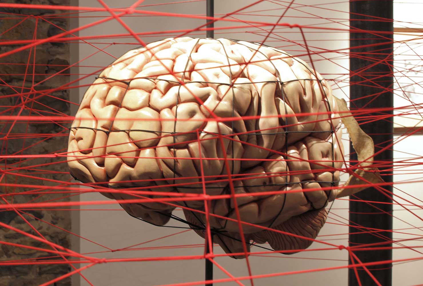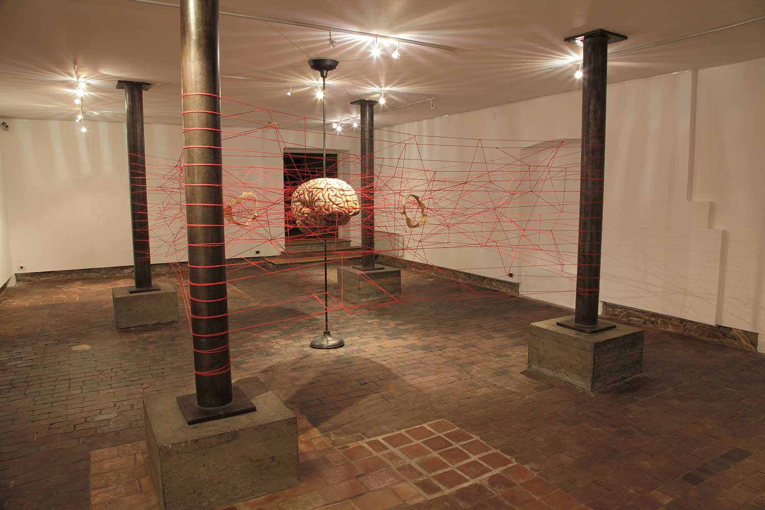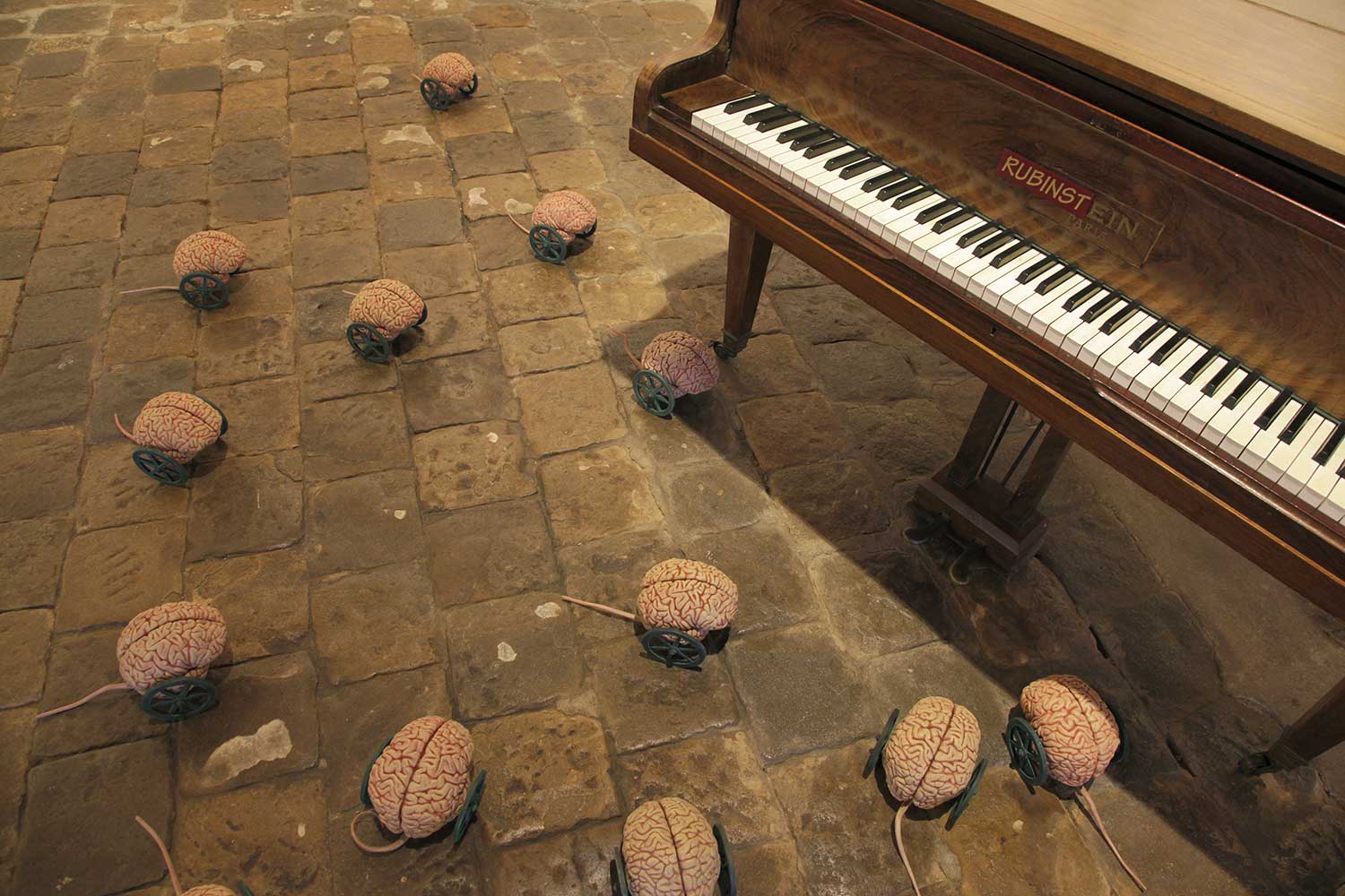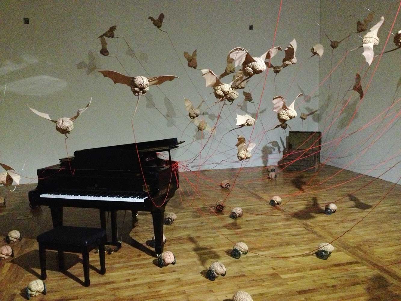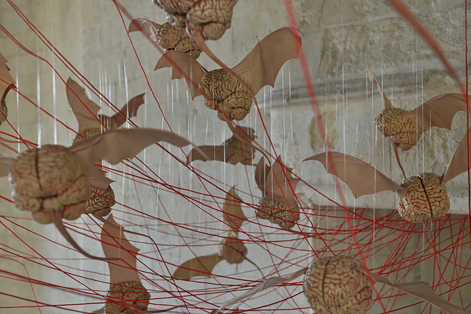 Installation sur 200 m2, 63 cerveaux volants et 63 cerveaux roulants (résine polyuréthane, acier, film polyester thermorétractable), un cerveau surdimensionné (résine polyester, acier, garcette noire), piano quart de queue, armoire et malles anciennes, mâchoires de requin, néon, garcette rouge