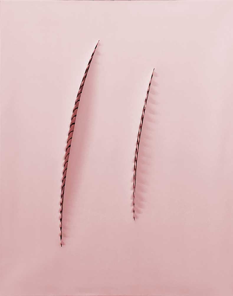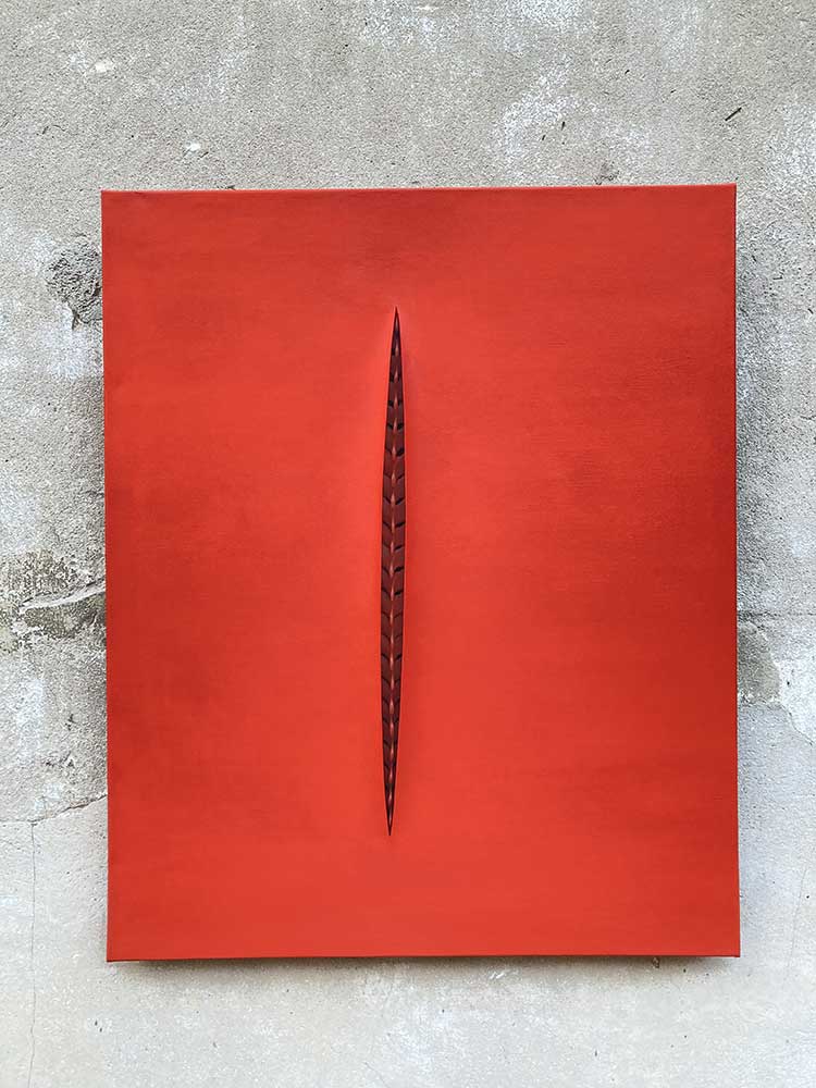 Si ces œuvres citent évidemment Lucio Fontana se référant au Spatialisme et à la volonté de synthétiser la vibration, le mouvement et l’espace dans une même œuvre, je suis arrivé à ces formes de manière empirique, par tâtonnements, avec un résultat inverse dans le mouvement à celui de l'artiste italien (c’est-à-dire que les lèvres de l’incision s’ouvrent vers l’extérieur de la toile, alors que les incisions de Fontana s’ouvrent vers le châssis).