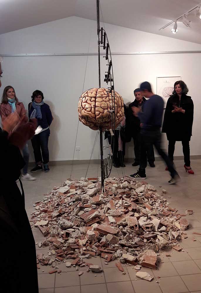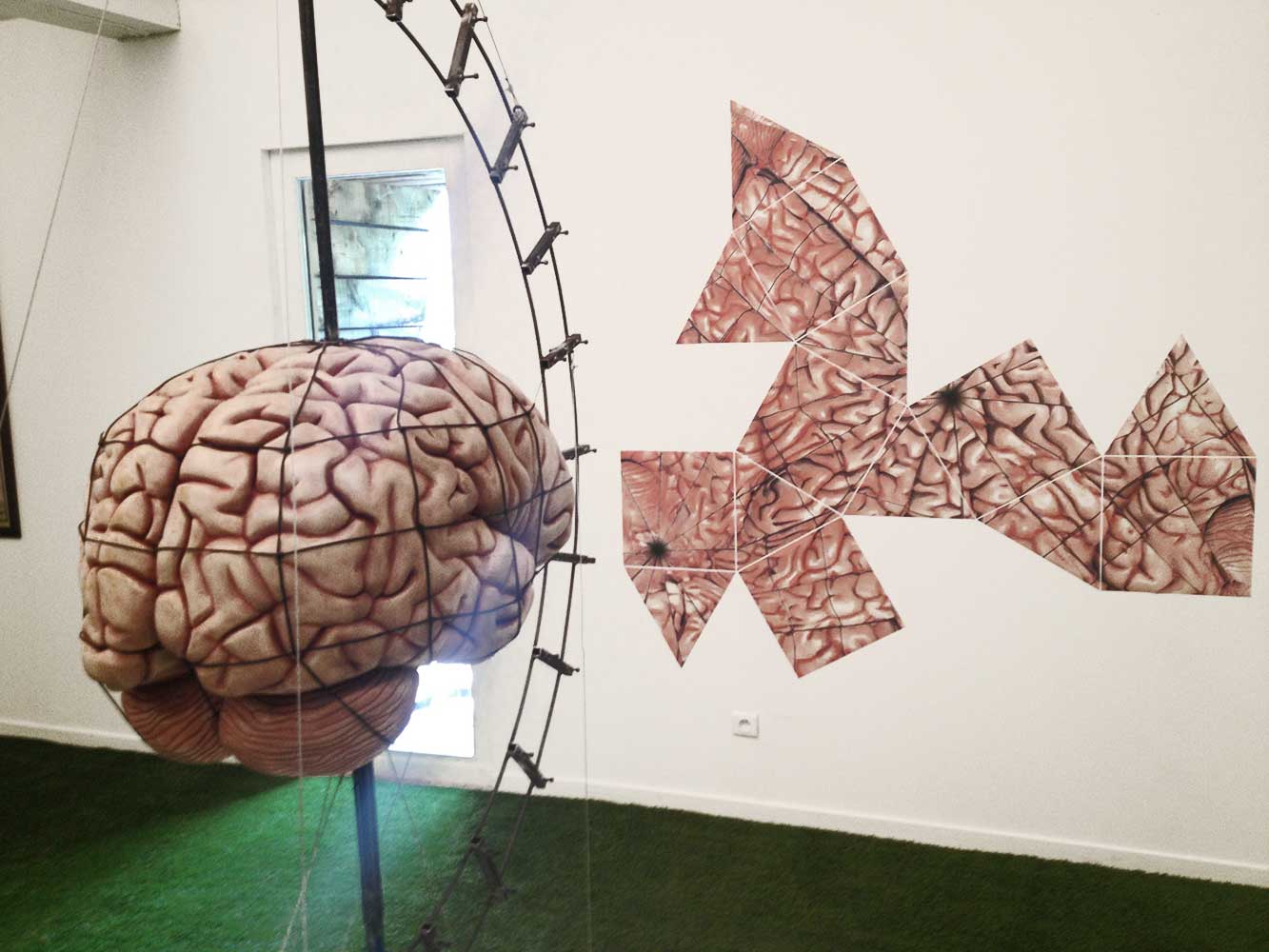 A l’heure où le réseau 2.0 tend à remplacer le réseau neuronal, cette installation renvoie à la matérialité du cerveau et des os. Elle est à la fois un autoportrait d’artiste isolé dans son univers et un questionnement sur la place de l’homme dans le cosmos.