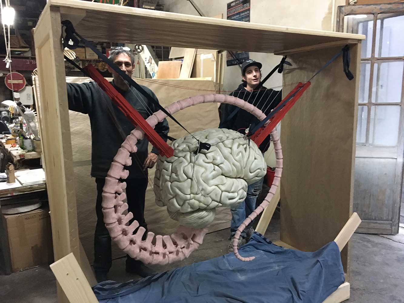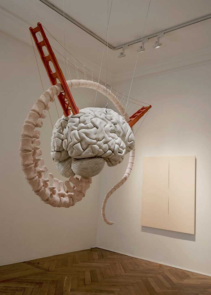 Un cerveau surdimensionné flotte dans l’espace, une suite de vertèbres l’entoure comme un anneau rose et lui donne ainsi une allure de planète aux couleurs lunaires.