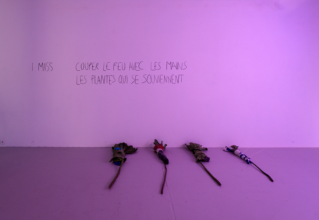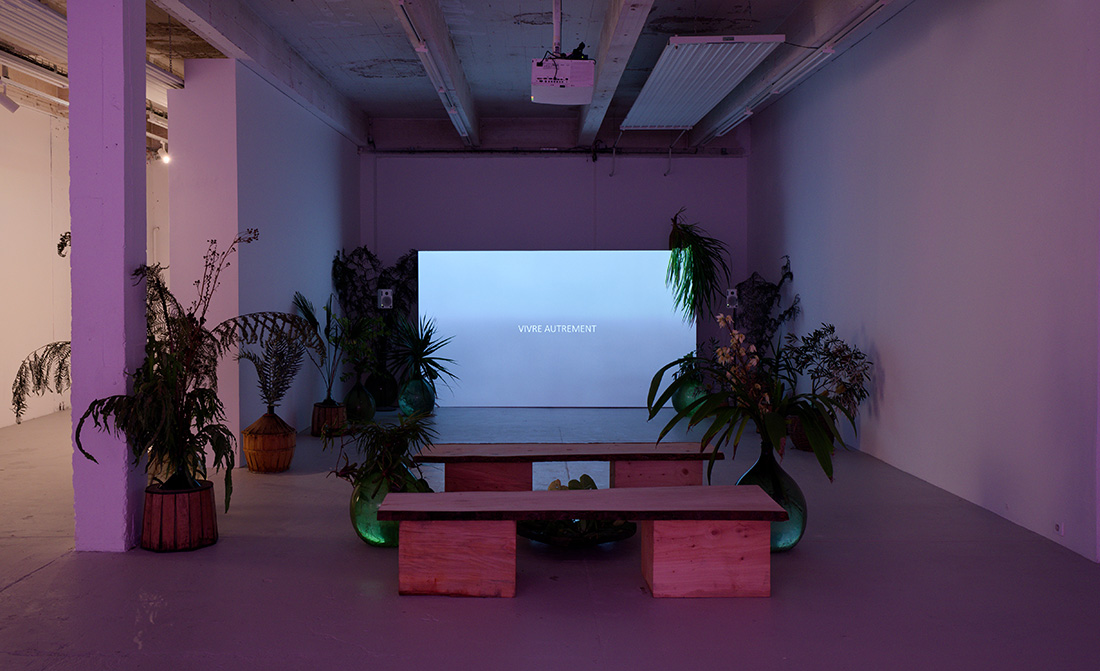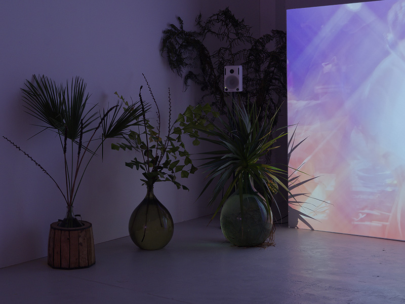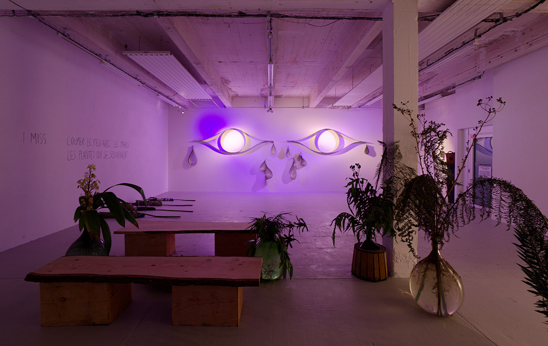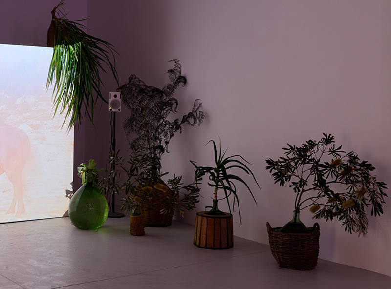 Vidéo, son, lumière colorée, plantes en voie d’extinction, dames jeannes, résine de pin, lames de scie, bois brut, osier, texte, charbon, veste