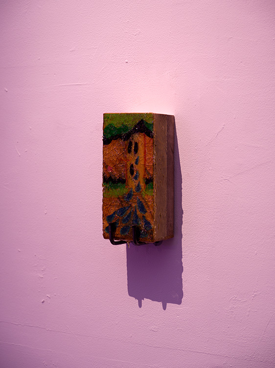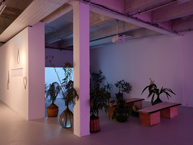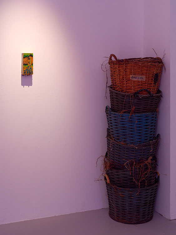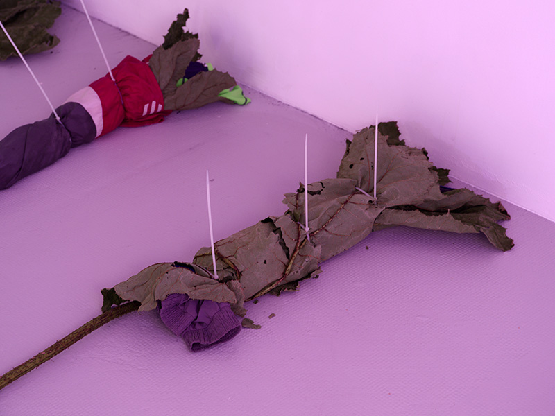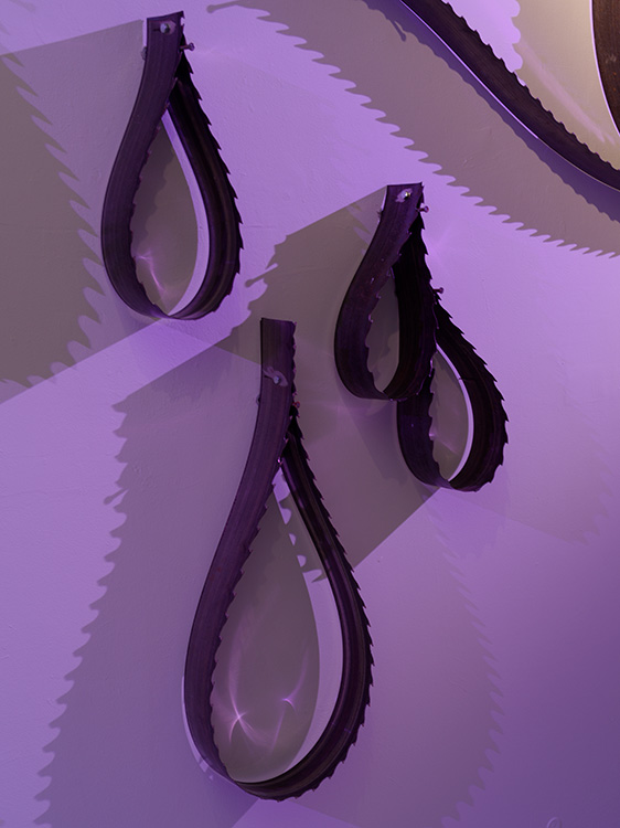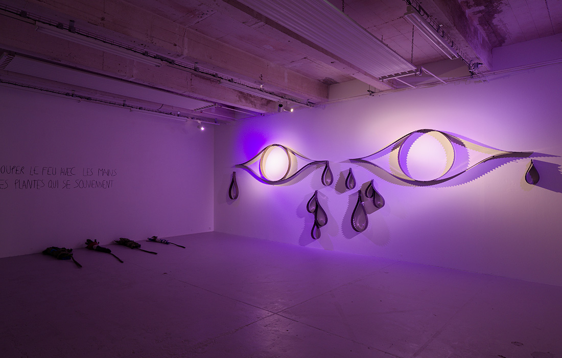 Vidéo, son, lumière colorée, plantes en voie d’extinction, dames jeannes, résine de pin, lames de scie, bois brut, osier, texte, charbon, veste