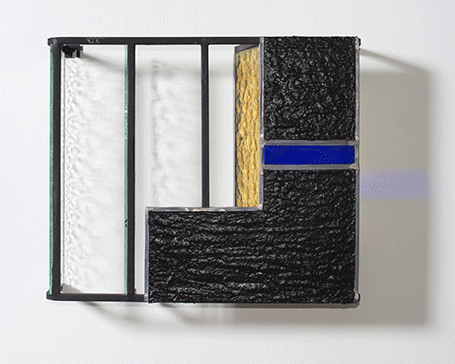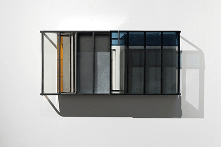 Continuing his work on the standardized architecture of suburban houses, Wilfrid Almendra presents a new series entitled Model Home (Sonata), in reference to this type of music in several movements. The diversion of various materials salvaged from construction sites of individual houses such as Phoenix, emblem of suburbia in the 80s, leads to forms instantly recognizable but unrelated to their original function. The yellow glass tiles of the entrance, the safety glass of the basements as well as the opaque tiles of the bathrooms of these houses are mounted on an entry railing or an anti-burglar bar to give a new form of ideal. The sculpture similar to a stained-glass window brings a new dimension both ornamental and sacred, giving to these scrap materials a new value, between fragility and nostalgia for bygone days.