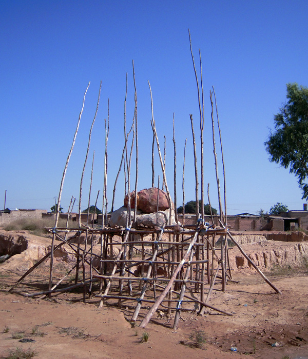 J’avais pour ma part utilisé de grandes perches d’eucalyptus de six à huit mètres de long servant ici à monter des échafaudages, à construire des abris, à faire du charbon de bois et à subir toutes sortes de transformations indispensables à la vie quotidienne. J’avais également employé la terre du site que j’avais achetée aux femmes chargées de l’extraire. En choisissant de travailler comme les artistes africains, pour apprendre d’eux ce que je ne savais pas, j’ai su en direct en quoi les conditions de travail, l’environnement, l’idéologie, la pauvreté des matériaux et de l’outillage, contraignaient violemment la création d’une œuvre. Je ne l’ignorais pas bien entendu, je le savais ailleurs dans le confort de mes habitudes qui en gommaient les aspérités, et dans les mots qui pouvaient en dissimuler les faiblesses. De toute façon il n’y avait rien d’autre à faire et l’esthétique du bricolage qui pèse assez lourdement sur une bonne partie de l’art contemporain trouvait ici son pendant. L’écart était grand avec ce que je vivais habituellement, mais je trouvais là un point de rencontre troublant.