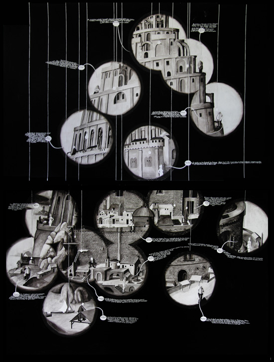 Gouache noire sur papier, quatre éléments, chacun 120 x 190 cm