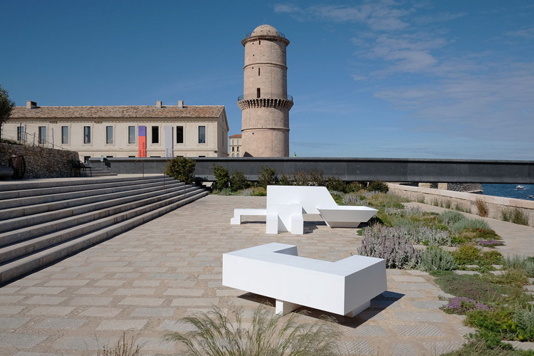 Ces petits îlots-mobiliers sont inspirés de différents éléments de l’espace public méditerranéen. Ils sont les formes construites d’une utopie modeste et fédératrice : faire salon, être dehors et ensemble. Inspirés des espaces et des pratiques des élèves dans leurs villes, ces mobiliers hybrides réunissent plusieurs lieux et plusieurs époques. Les jeunes habitants ont permis à l’artiste de comprendre l’histoire de chaque lieu qu’ils ont eux-mêmes redécouvert par la promenade : regarder leur environnement quotidien comme un paysage, être attentifs à ses transformations, en collecter des images. Avec ces objets caractéristiques, l’artiste a ramené un bout de ville et d’histoire pour proposer avec les élèves de nouveaux lieux de sociabilité. La forme des îlots est massive, comme un rocher sur lequel on peut grimper. Ces petites utopies sont offertes aux multiples usages qu’en feront les promeneurs du musée. Ce travail a eu lieu dans le cadre du projet de coopération éducative internationale, le Med Lab Educatif qui vise à réunir des élèves du pourtour méditerranéen autour de réflexions sur l’identité méditerranéenne. Chaque année, depuis 2013, un artiste intervient auprès de ces jeunes pour questionner, interroger et participer ensemble à une œuvre commune. Cette année, c’est dans le cadre d’un programme européen Erasmus + que des élèves de Croatie, d’Espagne, de France, de Grèce et d’Italie ont questionné les espaces publics et l’architecture de leurs villes.