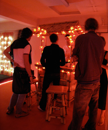 mini scène, rideaux filaires et lamés, parfum, guirlandes...