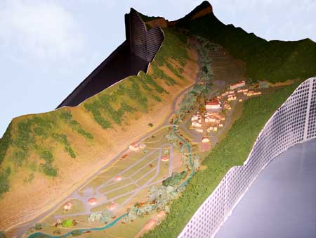 Bois, cartons, plastique, peinture, 200x93x20 cm, maquette 1/2000 Immeuble à toit convexe, comprenant un village vacance, un complexe thermal, une piste cyclable, divers sentiers