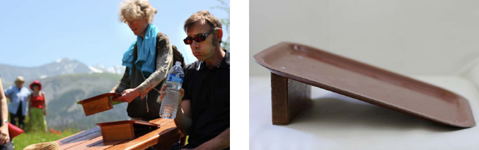 Aux abords d’un complexe touristique de moyenne montagne, trois tables de pique-nique occupent une pente à forte déclivité. Le dispositif est complété par des plateaux-repas pour lesquels des cales ont été conçues afin de compenser l’angle de la pente.