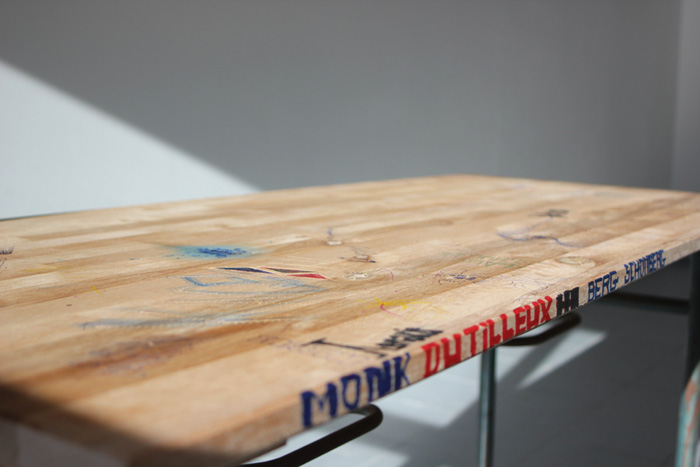 Gravures et encres sur bois, piétement métal de bureau scolaire et chaises, 125 x 70 x 72 cm environ |