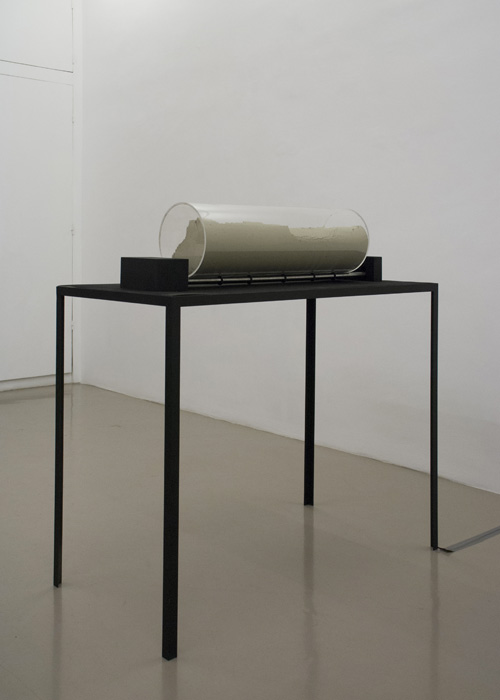 Les motifs de la boucle et de l’illusion se retrouvent dans la pièce de Fouad Bouchoucha qui consiste en un cylindre en verre rempli de poudre et soumis à une rotation continue. Dans un acte sériel mais jamais identique que l’artiste compare aux boucles accumulatives de la musique transcendantale, un relief montagneux se forme et se reforme sans répit. |