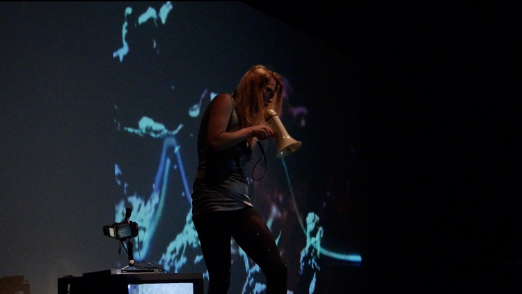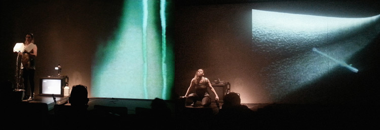Etrange rencontre entre la musique, la projection filmique et la scène. Cet objet scénique se construit autour d’un ensemble de propositions où les actions, la présence du corps s’imbriquent dans une suite de séquences/scénettes associées simultanément à la projection vidéo. Les deux artistes sont placés d’un bout à l’autre de la scène. |