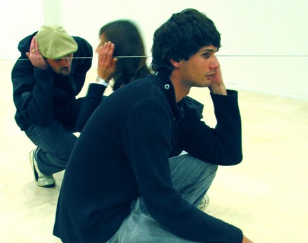La partie visible de l’installation est simplement occupée par un câble en acier. Une ligne tendue en travers d’un lieu vide et calme. Ni sons ni mouvements ne perturbent cet espace. Pourtant le filin est activé. Des ondes vibratoires l’habitent. Elle deviennent perceptibles à son contact.
