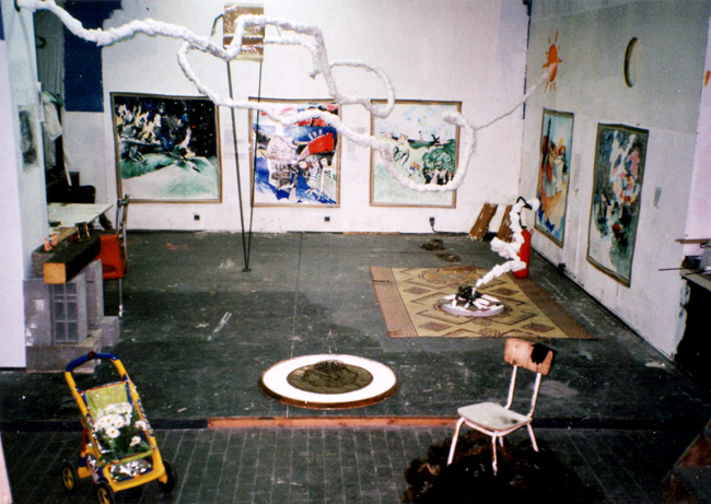 Feu, tapis, coton, fil de fer, extincteur, avec Karine Meyfret, Villa Arson 2002