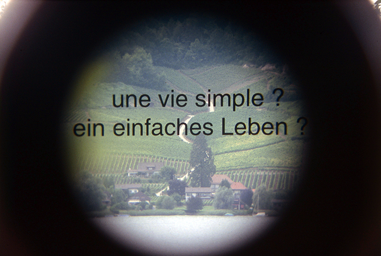 Une question - une vie simple? - se superpose à l'image du paysage. Elle est issue des textes de notre mécène, qui souhaite une vie simple aux travailleurs qui partent à la retraite après une vie de labeur ! La phrase gravée laisse le magnifique paysage de Morat tout à fait visible, le lac, les cygnes, les bateaux, les maisons cossues, les vignes…