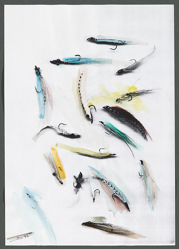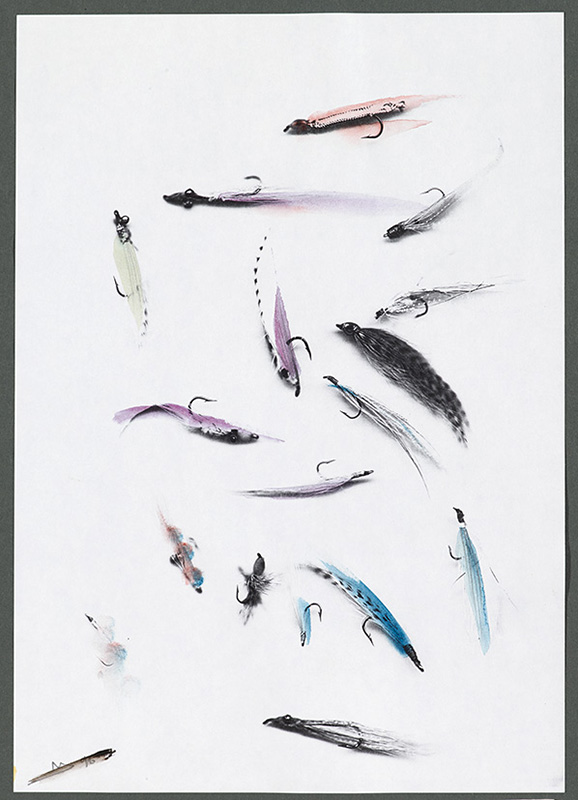 Hameçon, plumes, fils et perles, 25 x 15 cm |