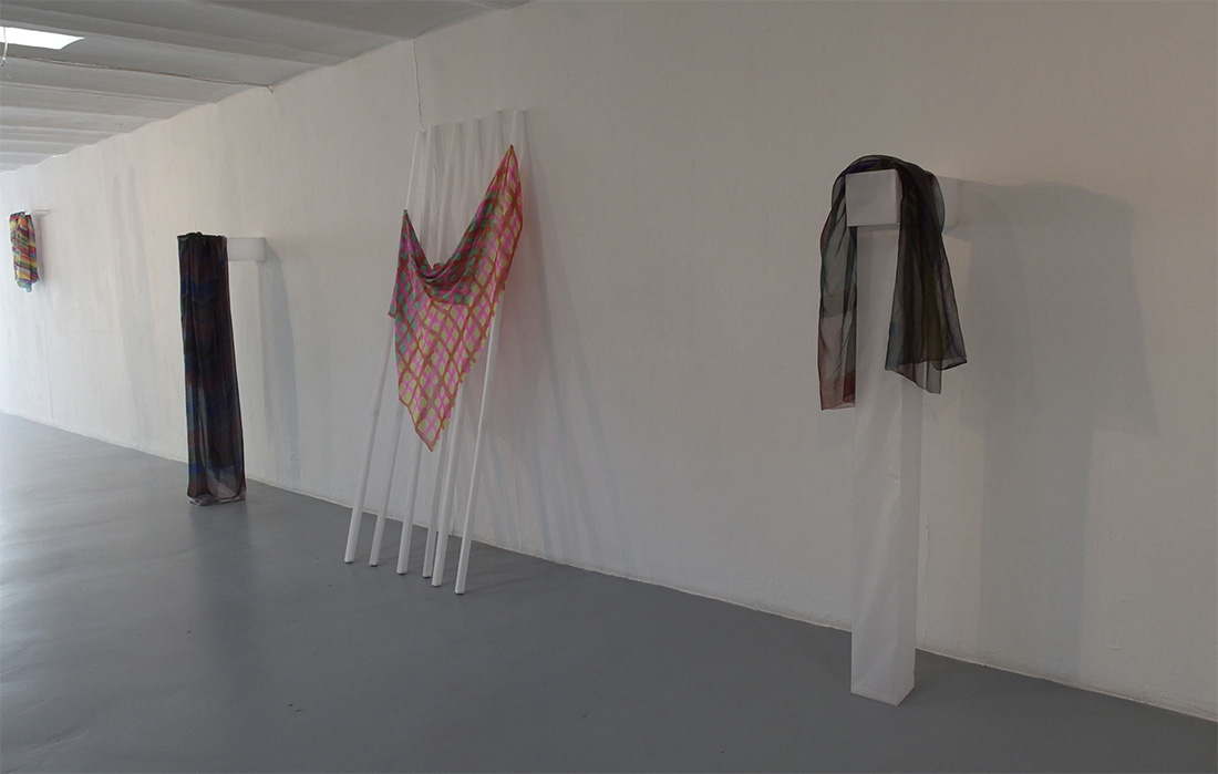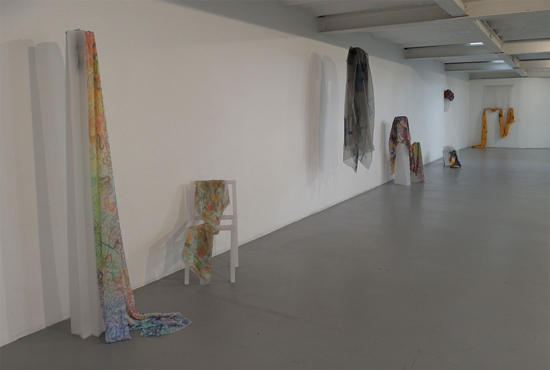 Des pièces de soies peintes aux couleurs souvent vives et aux motifs abstraits sont associées à des morceaux de papier calque blanc rendus volumineux par le pliage ou le froissement. Dans cette mise en scène des supports, le calque apparaît comme un passage vers le tissu peint, la première étape du processus.