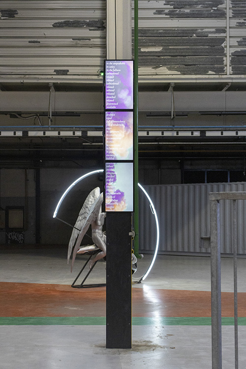 Léo Fourdrinier installe un ensemble de sculptures récentes dont la plus spectaculaire, Mind and Senses Purified (Icare) – vue à la Biennale de Lyon – se déploie dans un mouvement de lumière, de moto retournée et d’ange déchu. Très vite, la narration se met en place, un sentiment de vitesse, celui de l’orage et de la lumière accompagne la chute inexorable de la moto. L’artiste nous parle alors du culte de la vitesse, d’Icare monté trop vite, trop haut. Chaque élément faisant directement signe vers l’Histoire, la mythologie et une certaine culture populaire.