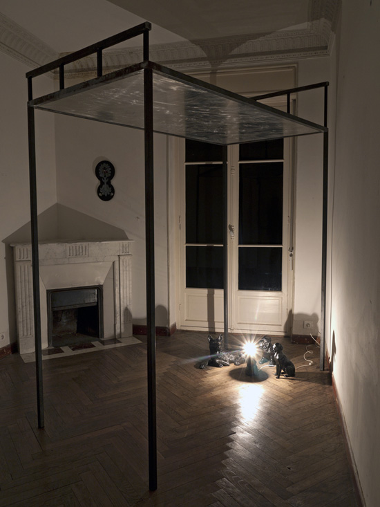 Effectivement, si je l’ai baptisée « Adolescence », c’est que cette pièce est une œuvre narrative constituée d’éléments biographiques. Elle m’a également été inspirée d’une chanson de Keny Arkana, une rappeuse marseillaise qui parle des jeunes attirés par la vie dans la rue. J’ai moi-même, quand j’avais 17 ans, vécu de cette manière, nomade, précaire, en squat avec des punks à chiens. Je jonglais dans les rues, offrais du spectacle comme on dit. Il était fréquent de dormir à la belle étoile. Le lit est un lit d’ado, un lit d’internat, avec des barreaux volontairement très hauts, démesurés, inatteignables. Il a été réalisé sur plan. Au sommet, il y a une plaque d’aluminium brossé, rayé, qui donne à voir une manière de voie lactée, de ciel étoilé. Quand aux sculptures de chiens posées en dessous, elles évoquent ceux qui nous accompagnaient, nous protégeaient quand nous dormions à ciel ouvert. Ce sont des sculptures dénichées dans des brocantes, repeintes en noir, trois chiens adultes et un chiot avec une ampoule sur la tête, la seule source de lumière !