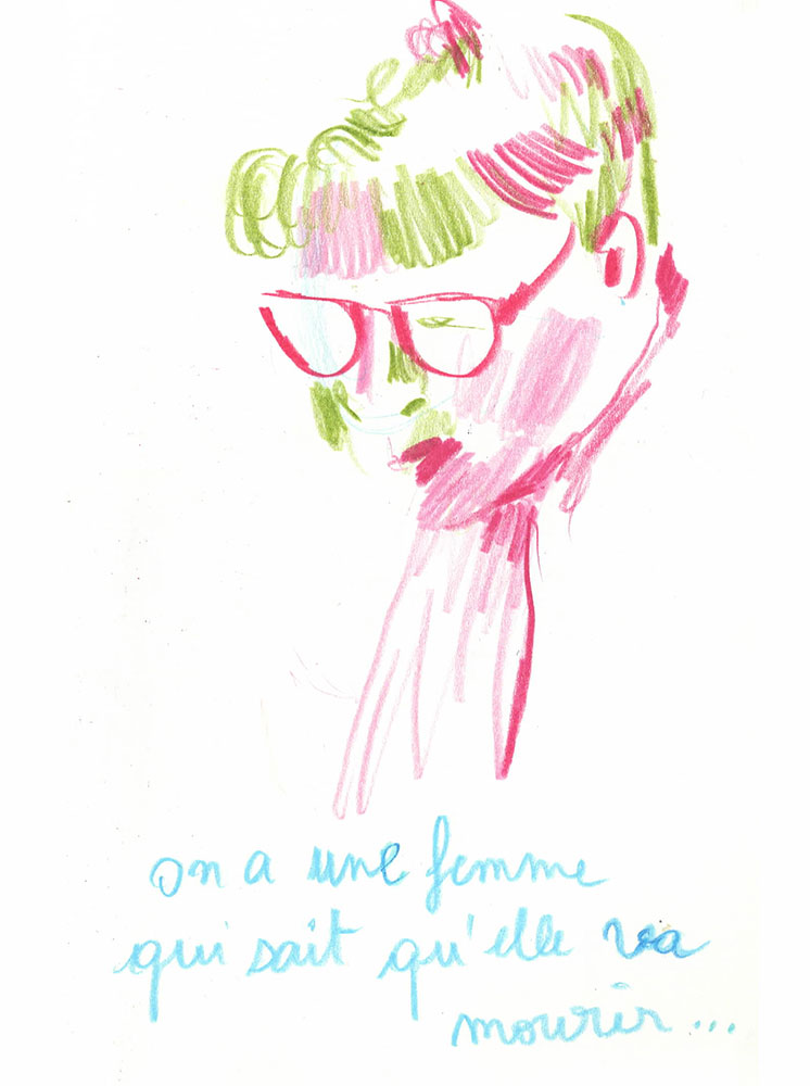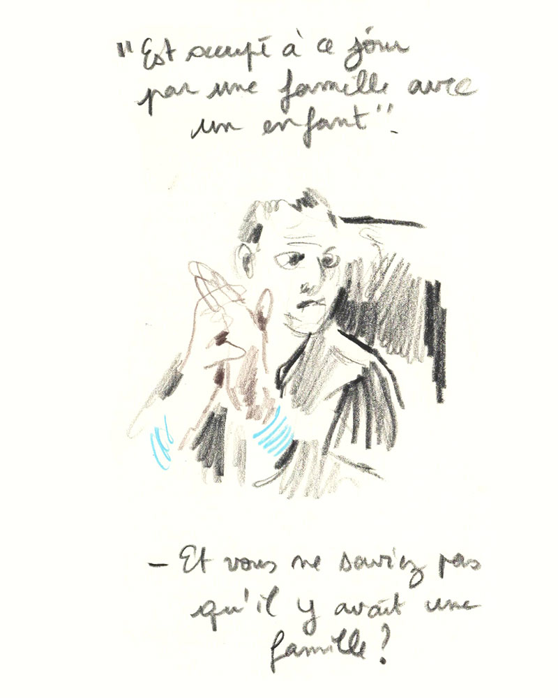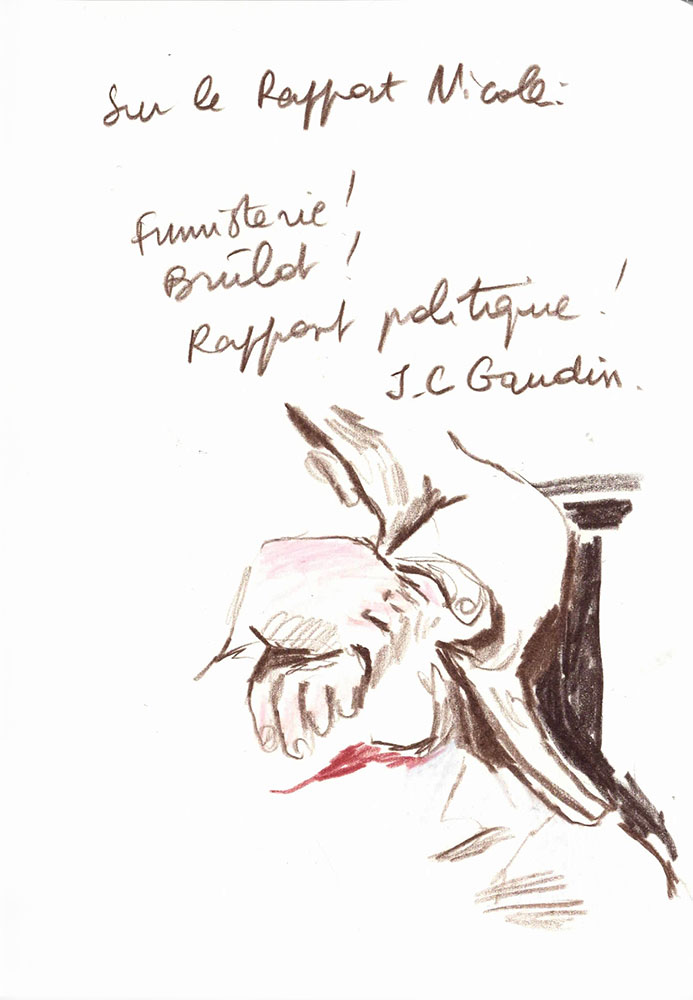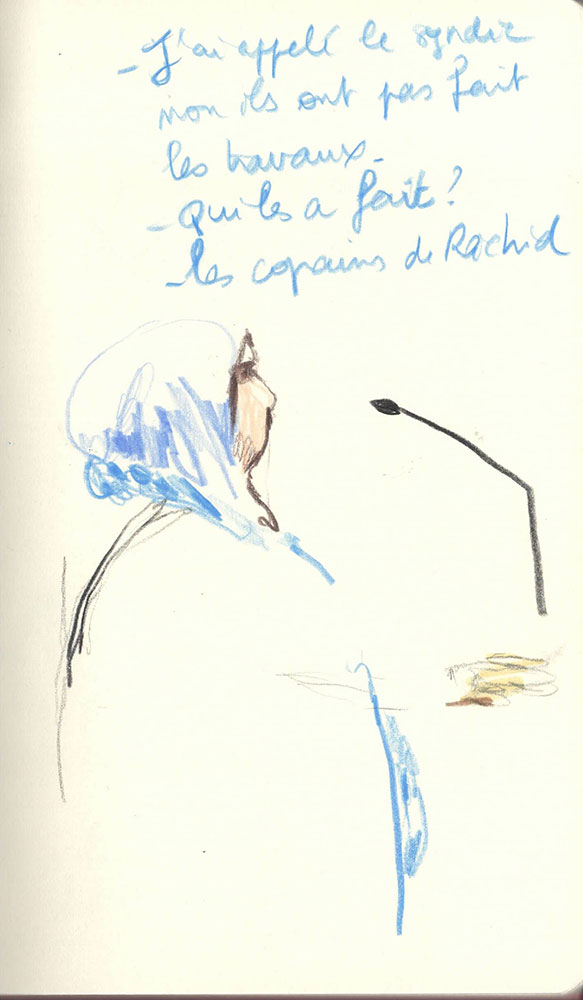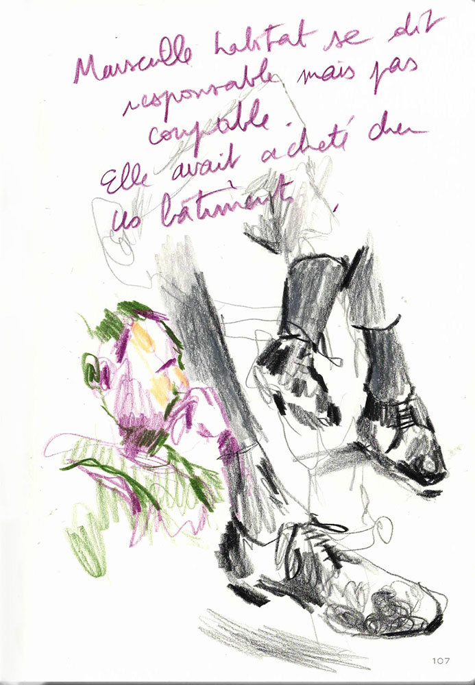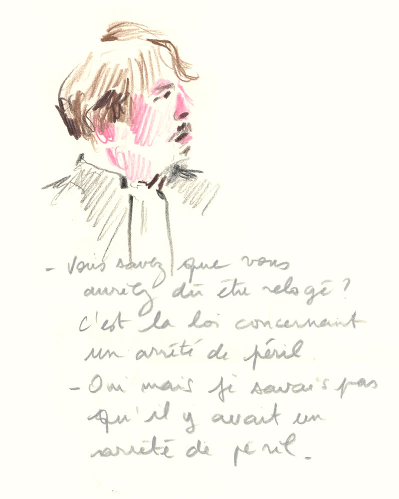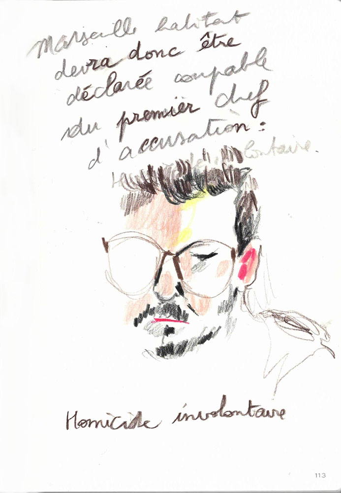 Un procès rassemble un groupe d’infortune à dessein d'écrire une histoire commune, la version reconnue d’un évènement. J’ai dessiné lors du Procès des effondrements des immeubles de la rue d’Aubagne dans la salle des procès hors norme du tribunal judiciaire de Marseille en contre-bas du président et des assesseurs, entre le greffier, le procureur et la traductrice, face aux parties civiles, au banc des accusés et à des nombreux avocats pour tenter de saisir ce qui est dit à la barre mais néanmoins en marge. Dans le recueil intitulé Marginalia, Edgar Allan Poe écrit :« La plus grande partie de la vérité est émise de façon impulsive, aussi, la plus grande partie de la vérité est parlée et non écrite ».