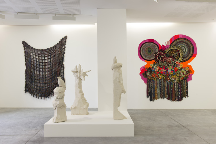 A la rationalité expérimentale de Virginie et à son humour discret répondent l’extraversion artistique de Sandra Lecoq: une forme de vitalisme qui ne craint ni la surcharge, ni la provocation, ni l’intrication dans l’oeuvre d’une part autobiographique, toutes choses constituant le carburant énergétique de son moteur de production. Pour l’exposition elle met en regard des pièces au mur, une photographie et des éléments de sculpture. Cet échantillonnage de son oeuvre récente fait la part belle à de grands assemblages qui occupent la situation murale de la peinture. Ils se composent d’une frise exubérante de fragments de tissus marouflés sur des supports rigides d’où surgissent des flots de cravates d’hommes qui pointent vers le sol comme autant de coulures readymade. Là, comme chez Virginie, l’évocation de la peinture se fait au travers d’un dispositif non pictural, mais l’abstraction qu’il convoque se rapproche plus des assemblages néo baroques d’un Stella dernière manière que de géométries austères des pères fondateurs de la peinture abstraite. Face à cette exubérance, puissante par ses couleurs et le rythme dynamique de sa composition, Sandra installe la blancheur plâtrée des “uccelli di felicita” qui semblent la traduction en sculpture de dessins d’oiseaux dont ils conservent quelque chose de la spontanéité du geste. En contrepoint elle montre aussi une photographie “Gio et le coq” où l’on voit un enfant (son fils Gio) dessiner sur le dos de sa mère le coq qui la signifie patronymiquement.