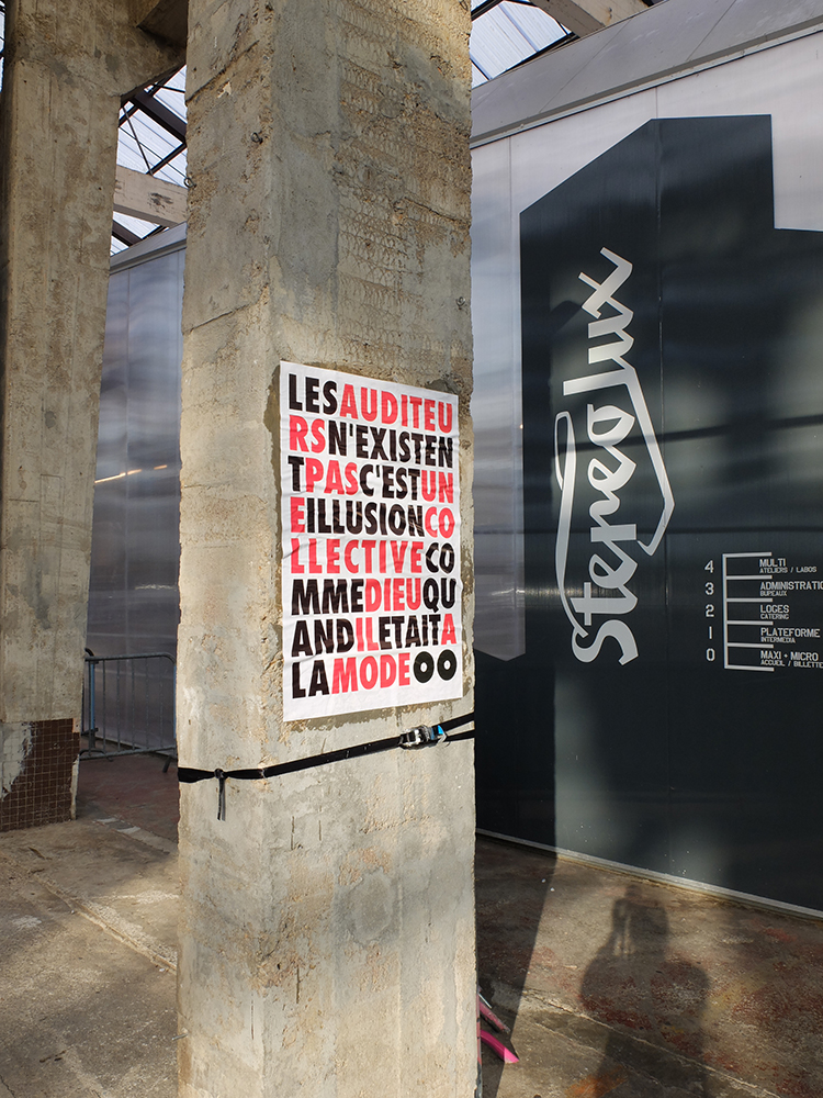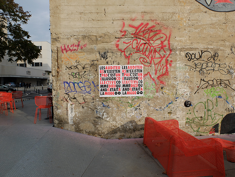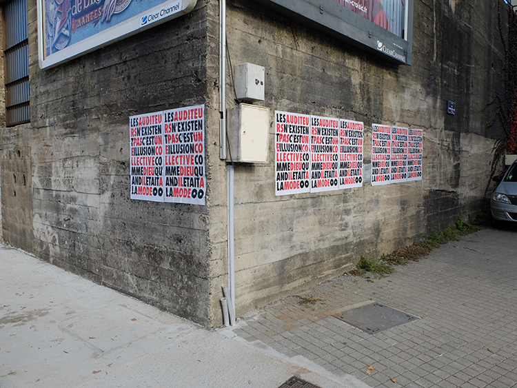 Les Auditeurs n'existent pas (affiches) 2018 80 cm x 60 cm (chaque) / impressions offset / tirage illimité Campagne d'affichage sauvage dans les rues de Nantes réalisée pour l'exposition Mes Camarades et moi-même à HAUS