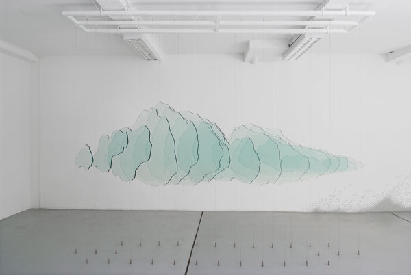 Verre, câbles, structure métallique, 405 x 165 cm (hauteur du nuage:114 cm)