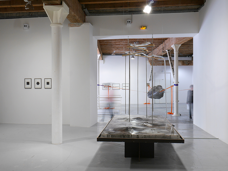 Poussières de marbre, eau, pompe à eau, acier, bois, géotextile, bassine, dimensions variables, plateau : 300 x 150 x 65 cm