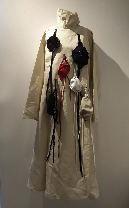 Blouse et tablier, toile de coton beige, fils de coton rouge, fils de métal, vitrines, 40x40x170 cm |