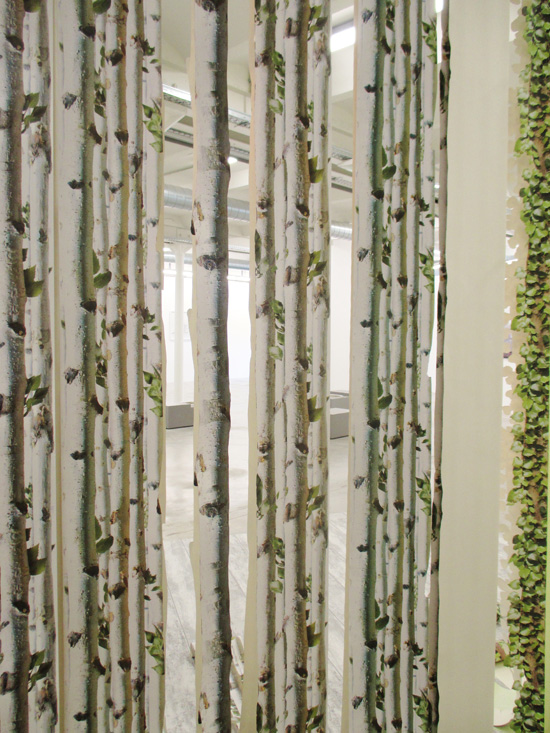 La découpe du plateau reprenant le dessin de planches – plancher du théâtre – joue avec les colonnes du lieu donnant l'image d'un plateau provisoire ou d'un modèle d'exposition. Ici constitué de lés de papier peint, le mur du fond crée une sensation de relief et un trouble dans l'illusion des matières végétales.