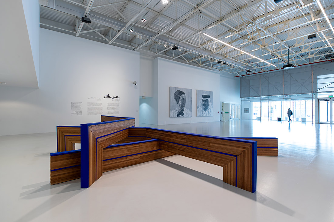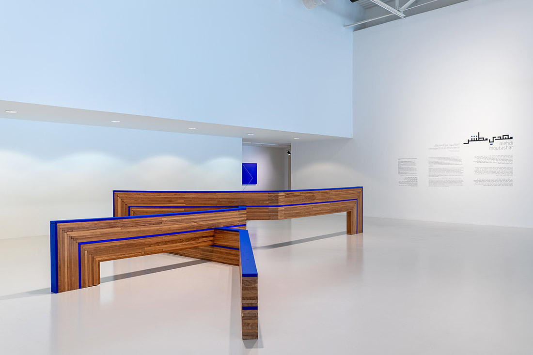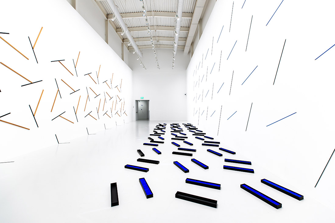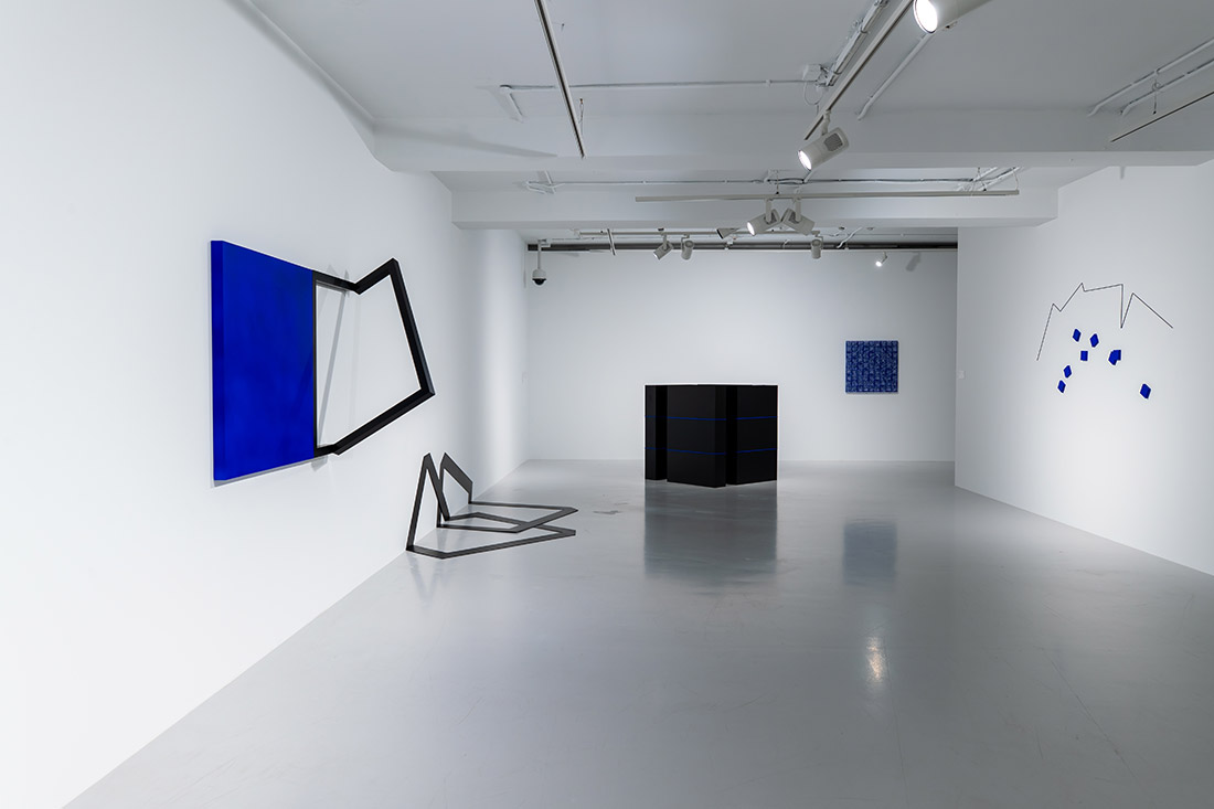Déployée sur les murs et le sol, cette installation est très clairement dédiée au concept de l'arabesque et à son principe de continuité ; elle repose sur une trame dont le dessin se révèle et se matérialise différemment selon l'endroit où elle se développe : sur les parois latérales, avec d’un côté des séquences de fils élastiques noirs et bleus en tension, et de l’autre, des modules formés par des segments de métal et de bois naturel ; au sol, avec 72 UPN métalliques dont la cavité centrale est tantôt laissée vide, tantôt remplie de pigment en poudre bleu outremer.