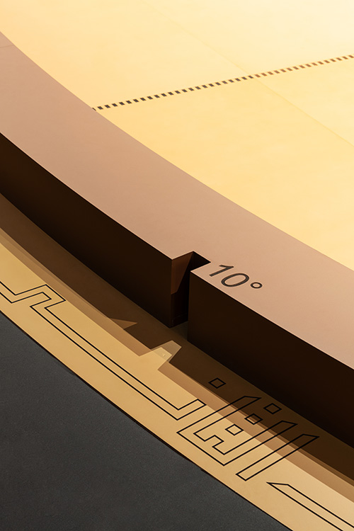 En bordure du plateau, deux bandes en relief portent des encoches correspondant à des repères de d’espace-temps : les degrés, marqués de 10 en 10 jusqu’à 180° sur chaque demi-cercle. La bande intérieure indique les heures de nuit, la bande extérieure celles du jour, scandées par des volumes bleu outremer. Au-delà de la bande intérieure, côté sud, sont gravés à titre indicatif les mois de décembre et janvier, autrement dit le cycle d’une année.