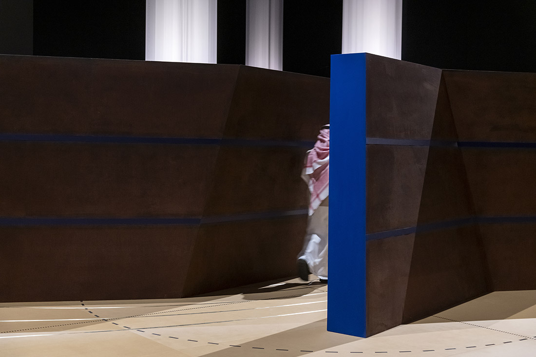 Leur écartement permet aux visiteurs de rentrer à l’intérieur du dispositif et d’expérimenter physiquement la notion d’espace et l’orientation. |