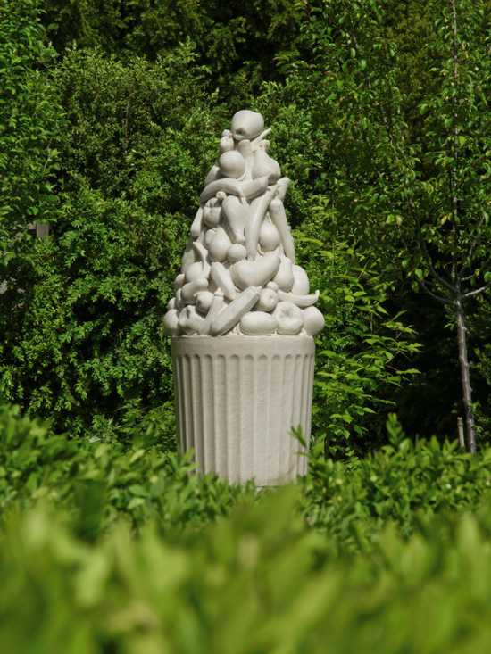 Traversé le jardin médicinal aux vertus hallucinatoires, vous voici maintenant au potager. Telle une céramique délicate aux glacis qu’on imagine préparés par Luca Della Robbia, une nature morte aux fruits s’élève au sommet d’un puissant socle triparti. Sans doute est-ce là un hommage au jardinier. Cet empilement savamment organisé vous fait imaginer, derrière l’amoncellement des poires et des pommes, auquel trois aubergines prêtent leur allongement, un portrait à la manière de Arcimboldo. Peut-être celui de La Quintinie, artisan à Versailles du Potager du Roi. Mais subitement vous pensez à tout cela dans la grande sécheresse de juillet, puis au terme des pluies de septembre. Les formes délicates s’estomperont et le portrait rêvé de La Quintinie sera peut-être passé alors par les mains de Giacometti. La ruine d’une pommette n’en abolira pas pour autant le sens. Il y aura autant de vérité humaine lorsque l’érosion aura défiguré ses formes délicates !