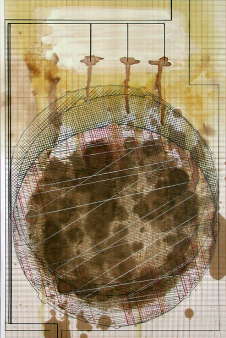 Eau & mousse savonneuse, huile de lin, encre, plume, acrylique, mine de plomb sur papier millimétré, 81 x 64 cm