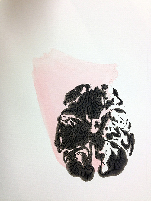 Eau savonneuse colorée, encre de Chine, plume, poudre de charbon sur papier Arches, 70 x 50 cm