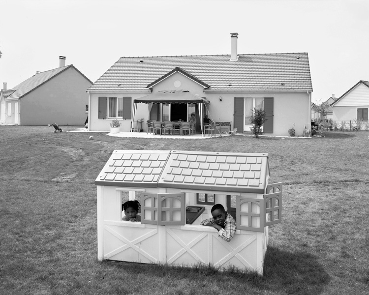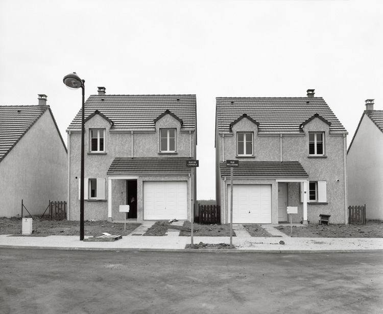 De 1997 à 2000, Jürgen Nefzger a photographié les zones pavillonnaires en construction autour du parc Eurodisney. Il restitue dans un registre documentaire la découpe d’un territoire et le surgissement d’une architecture modélisée. Mais la précision des photographies à la chambre 8x10”, l’absence de toute trace d’activité, si ce n’est comme une traversée d’un paysage, provoquent un effet de déssaisissement : nous n’y trouvons pas notre espace, nous sommes projetés dans une délocalisation sans attache. Il construit ainsi un oxymore visuel où le désir d’une individualisation de l’espace familial se contraint paradoxalement au semblable. Aux Portes du Royaume, on pénètre dans un monde où l’autre est d’abord ce semblable que les façades des pavillons répètent à l’infini avant que les gestes quotidiens créent les parcours et les réseaux qui rendront visibles les individus.