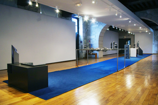 Pour l’exposition À bûche perdue, j’ai décidé de terminer la procession de sculpture sur le tapis de moquette bleue, par un des fauteuils qu’Akim Ayouche avait conçu et réalisé pour que le visiteur puisse faire face à mon travail plus confortablement lors d’Art-O-Rama 2009. Les sculptures qui se succèdent dans cette salle ont comme dénominateur commun d’être construites sur le modèle : un élément officiant de socle/un autre venant se positionner sur le dessus de ce socle.