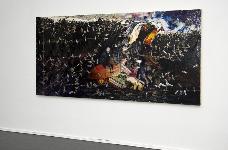 Labotomie aux oeillets 2009 Techniques mixtes sur toile, oeillets, sandow, métal, 363 x 190 cm