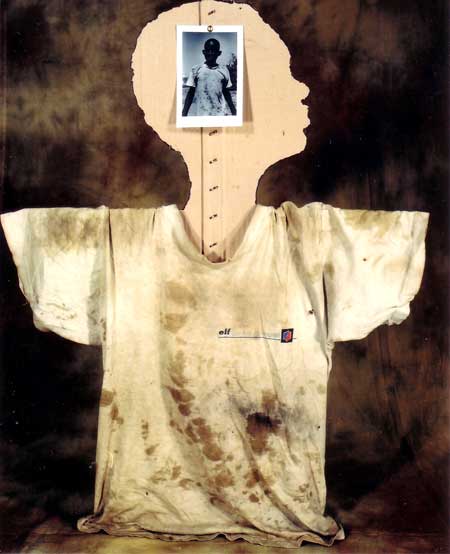 L'unification de la poussière, de la sueur et du sang sur ces vêtements de coton imprimé les transforment en "Véronique" de notre temps. Et puisque nous sommes en Afrique je pense aussi aux collectionneurs d'Art africain qui s'assurent que les masque de danse et de transe portent bien les marques de sueur pour en vérifier "l'authenticité".