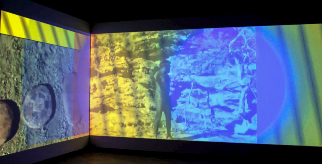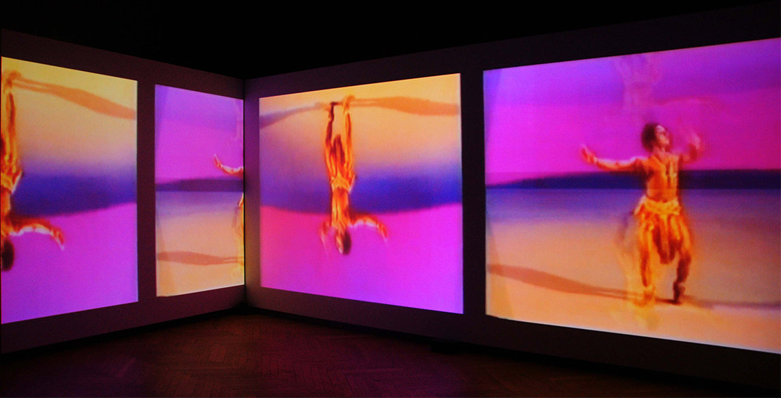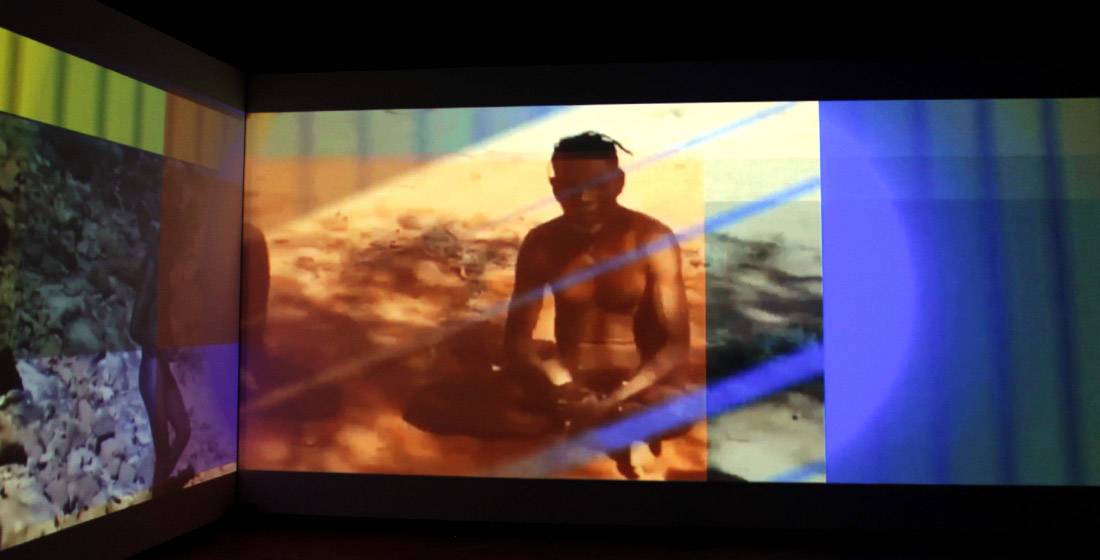 L’insertion de monochromes comme référents et portes de passage que l’on remarque très rapidement vient de son univers plastique (utilisation de l’art optique notamment) mais aussi d’une vision picturale du cinéma et de la vidéo confondus. Car ici les frontières entre genres sont poreuses comme sont poraux les fragments hétéroclites mis ensemble. Rien n’oblige le regardeur de connaître d’où viennent ce qui apparaît comme des citations. On reconnaît des fragments de documentaire sur l’Inde et sa danse et des images concernant les Aborigènes australiens.