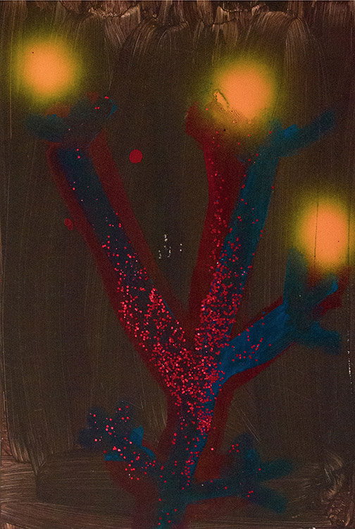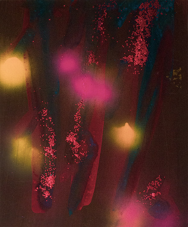 Pigment, spray, acrylique, paillettes et huile sur papier, 29 x 43 cm