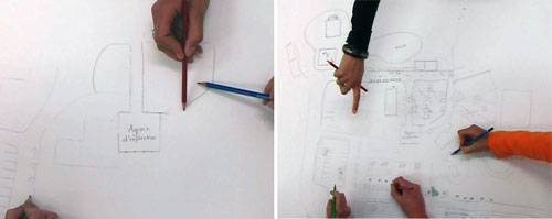 Différents exercices d’exploration et d’observation (promenades gauche-droite-gauche-droite, filature d’inconnus, description de mémoire d’un lieu affectif, dessin cartographique collectif, dessin d’après la description d’un autre…) nous ont permis de produire des traces photographiques, dessinées, écrites et orales, à partir desquelles nous avons contruit un film vidéo et une brochure qui transforment notre « chemin vers l’autre » à travers la ville en une fiction légère.